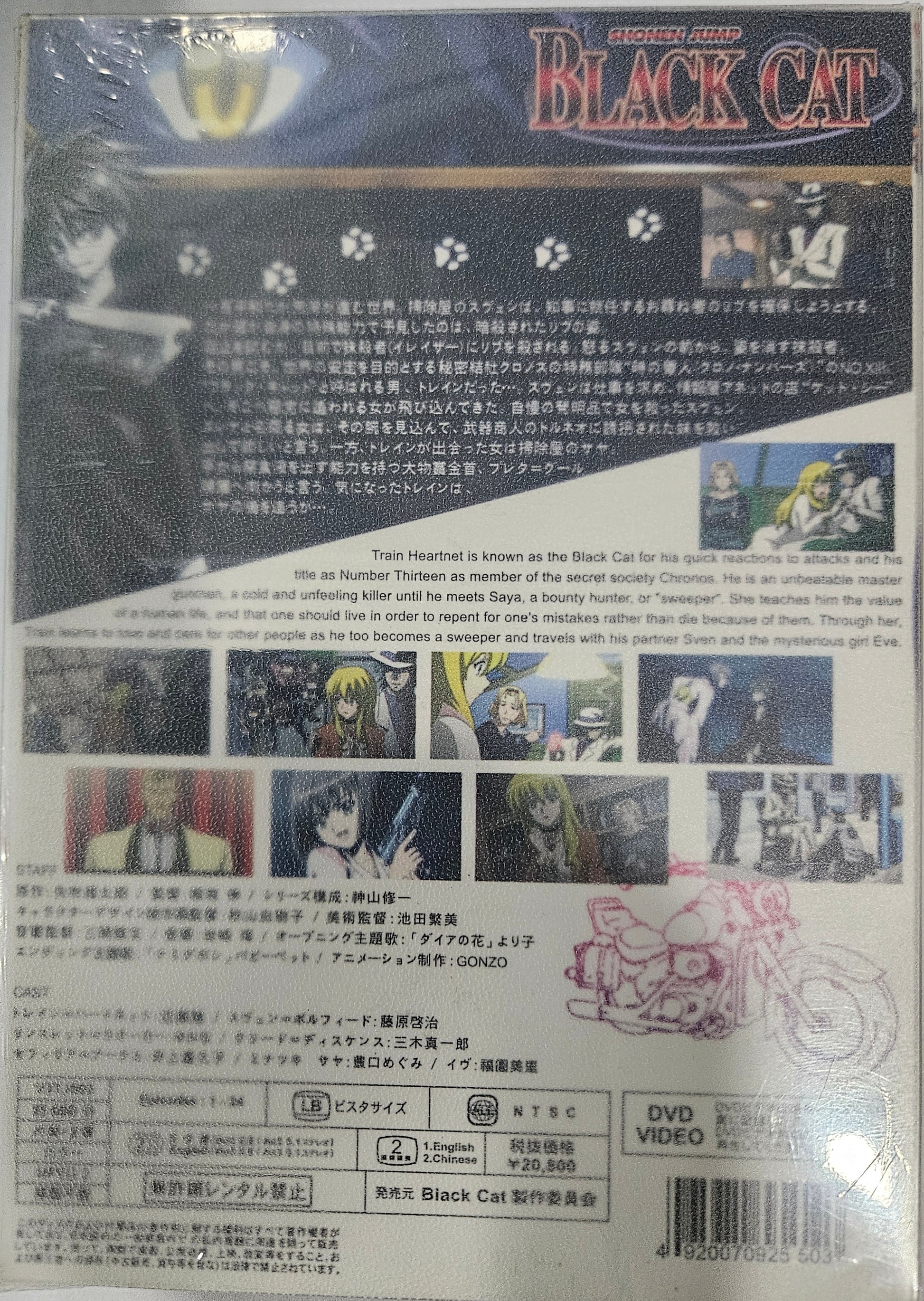 - Synopsis: Genres: Adventure, Comedy, Science Fiction, Shounen Age rating: Teenagers (May contain bloody violence, bad language, nudity) Director: Shin Itagaki Series Composition: Shuuichi Kouyama Script: Shuuichi Kouyama , Yuichiro Takeda Music: Taku Iwasaki Original Manga: Kentaro Yabuki Character Design: Yukiko Akiyama Art director: Shigemi Ikeda Chief Animation Director: Yukiko Akiyama Plot Summary: Train Heartnet is known as the Black Cat for his quick reactions to attacks and his title as Number Thirteen as member of the secret society Chronos. He is an unbeatable master gunman, a cold and unfeeling killer until he meets Saya, a bounty hunter, or "sweeper". She teaches him the value of a human life, and that one should live in order to repent for one's mistakes rather than die because of them. Through her, Train learns to love and care for other people as he too becomes a sweeper and travels with his partner Sven and the mysterious girl Eve.